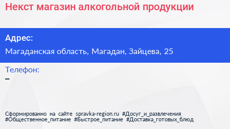 Некст, магазин алкогольной продукции по адресу Магаданская область, Магадан, Зайцева, 25 в дальнейшем Организация, размещена в следующих категориях:
