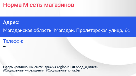 Норма М, сеть магазинов по адресу Магаданская область, Магадан, Пролетарская улица, 61 в дальнейшем Организация, размещена в следующих категориях: