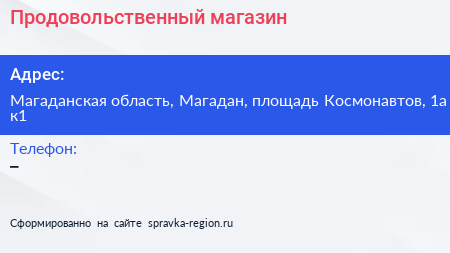 Продовольственный магазин по адресу Магаданская область, Магадан, площадь Космонавтов, 1а к1 в дальнейшем Организация, размещена в следующих категориях: