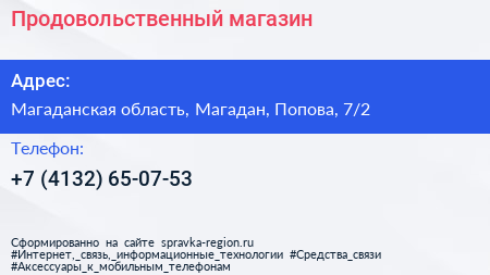 Продовольственный магазин по адресу Магаданская область, Магадан, Попова, 7/2 в дальнейшем Организация, размещена в следующих категориях: