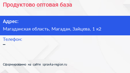 Продуктово-оптовая база по адресу Магаданская область, Магадан, Зайцева, 1 к2 в дальнейшем Организация, размещена в следующих категориях: