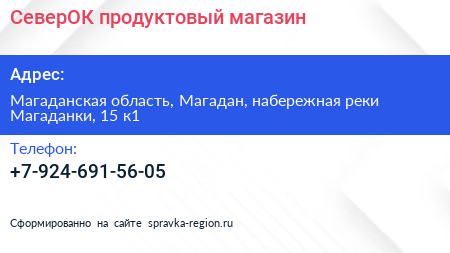 СеверОК, продуктовый магазин по адресу Магаданская область, Магадан, набережная реки Магаданки, 15 к1 в дальнейшем Организация, размещена в следующих категориях:
