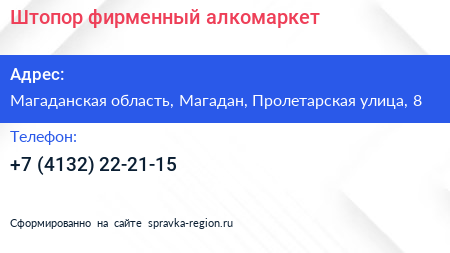 Штопор, фирменный алкомаркет по адресу Магаданская область, Магадан, Пролетарская улица, 8 в дальнейшем Организация, размещена в следующих категориях: