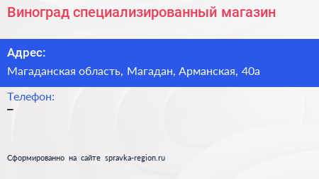 Виноград, специализированный магазин по адресу Магаданская область, Магадан, Арманская, 40а в дальнейшем Организация, размещена в следующих категориях: