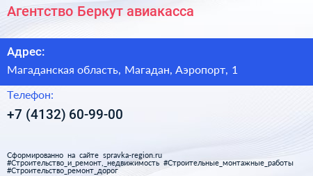 Агентство Беркут, авиакасса по адресу Магаданская область, Магадан, Аэропорт, 1 в дальнейшем Организация, размещена в следующих категориях:
