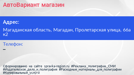 АвтоВариант, магазин по адресу Магаданская область, Магадан, Пролетарская улица, 66а к2 в дальнейшем Организация, размещена в следующих категориях: