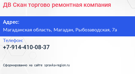 ДВ Скан, торгово-ремонтная компания по адресу Магаданская область, Магадан, Рыбозаводская, 7а в дальнейшем Организация, размещена в следующих категориях: