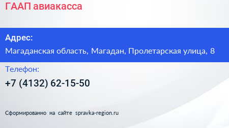 ГААП., авиакасса по адресу Магаданская область, Магадан, Пролетарская улица, 8 в дальнейшем Организация, размещена в следующих категориях: