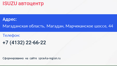 ISUZU, автоцентр по адресу Магаданская область, Магадан, Марчеканское шоссе, 44 в дальнейшем Организация, размещена в следующих категориях: