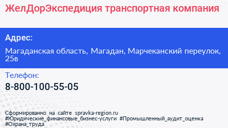 ЖелДорЭкспедиция, транспортная компания по адресу Магаданская область, Магадан, Марчеканский переулок, 25в в дальнейшем Организация, размещена в следующих категориях: