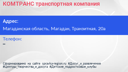 КОМТРАНС, транспортная компания по адресу Магаданская область, Магадан, Транзитная, 20а в дальнейшем Организация, размещена в следующих категориях: