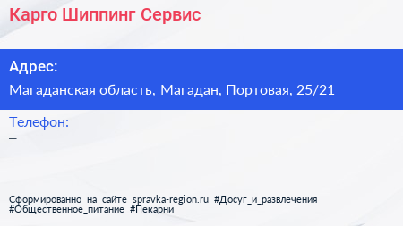 Карго Шиппинг Сервис по адресу Магаданская область, Магадан, Портовая, 25/21 в дальнейшем Организация, размещена в следующих категориях: