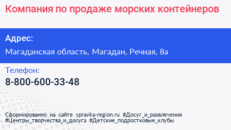 Компания по продаже морских контейнеров по адресу Магаданская область, Магадан, Речная, 8а в дальнейшем Организация, размещена в следующих категориях: