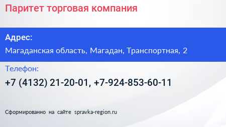 Паритет, торговая компания по адресу Магаданская область, Магадан, Транспортная, 2 в дальнейшем Организация, размещена в следующих категориях: