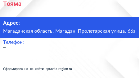 Тояма по адресу Магаданская область, Магадан, Пролетарская улица, 66а в дальнейшем Организация, размещена в следующих категориях: