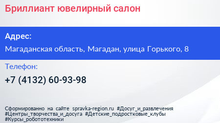 Бриллиант, ювелирный салон по адресу Магаданская область, Магадан, улица Горького, 8 в дальнейшем Организация, размещена в следующих категориях: