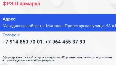ФРЭШ, ярмарка по адресу Магаданская область, Магадан, Пролетарская улица, 43 к1 в дальнейшем Организация, размещена в следующих категориях: