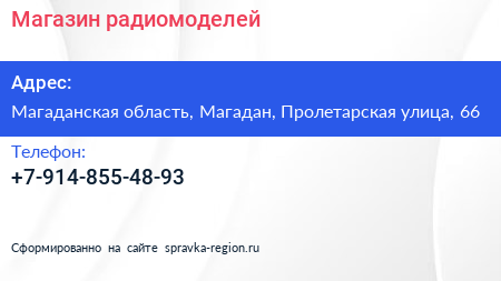 Магазин радиомоделей по адресу Магаданская область, Магадан, Пролетарская улица, 66 в дальнейшем Организация, размещена в следующих категориях: