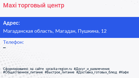 Maxi, торговый центр по адресу Магаданская область, Магадан, Пушкина, 12 в дальнейшем Организация, размещена в следующих категориях: