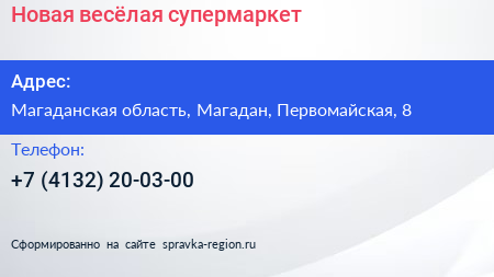 Новая весёлая, супермаркет по адресу Магаданская область, Магадан, Первомайская, 8 в дальнейшем Организация, размещена в следующих категориях: