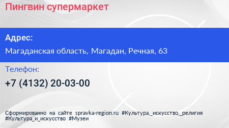 Пингвин, супермаркет по адресу Магаданская область, Магадан, Речная, 63 в дальнейшем Организация, размещена в следующих категориях: