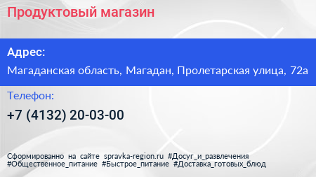 Продуктовый магазин по адресу Магаданская область, Магадан, Пролетарская улица, 72а в дальнейшем Организация, размещена в следующих категориях: