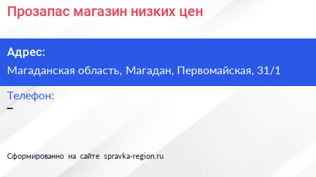 Прозапас, магазин низких цен по адресу Магаданская область, Магадан, Первомайская, 31/1 в дальнейшем Организация, размещена в следующих категориях: