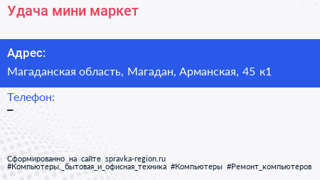 Удача, мини-маркет по адресу Магаданская область, Магадан, Арманская, 45 к1 в дальнейшем Организация, размещена в следующих категориях: