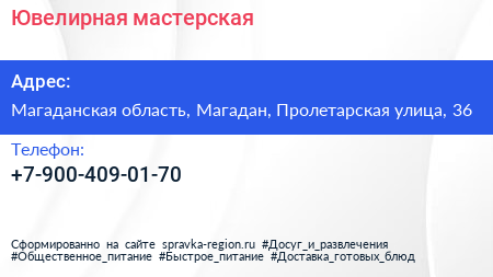Ювелирная мастерская по адресу Магаданская область, Магадан, Пролетарская улица, 36 в дальнейшем Организация, размещена в следующих категориях: