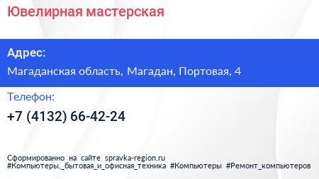 Ювелирная мастерская по адресу Магаданская область, Магадан, Портовая, 4 в дальнейшем Организация, размещена в следующих категориях: