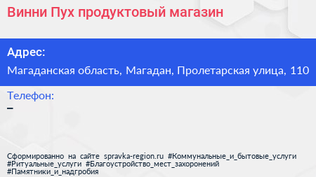 Винни Пух, продуктовый магазин по адресу Магаданская область, Магадан, Пролетарская улица, 110 в дальнейшем Организация, размещена в следующих категориях:
