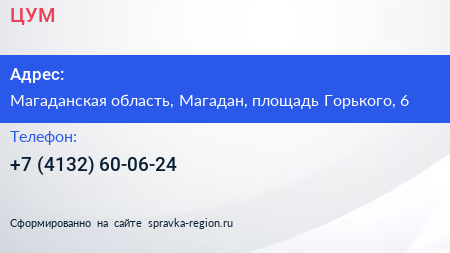 ЦУМ по адресу Магаданская область, Магадан, площадь Горького, 6 в дальнейшем Организация, размещена в следующих категориях: