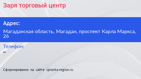 Заря, торговый центр по адресу Магаданская область, Магадан, проспект Карла Маркса, 26 в дальнейшем Организация, размещена в следующих категориях: