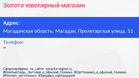Золото, ювелирный магазин по адресу Магаданская область, Магадан, Пролетарская улица, 11 в дальнейшем Организация, размещена в следующих категориях: