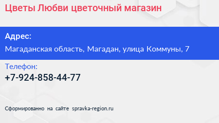 Цветы Любви, цветочный магазин по адресу Магаданская область, Магадан, улица Коммуны, 7 в дальнейшем Организация, размещена в следующих категориях: