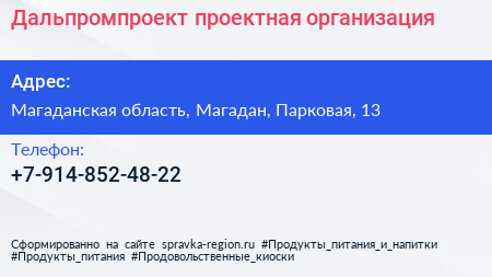 Дальпромпроект, проектная организация по адресу Магаданская область, Магадан, Парковая, 13 в дальнейшем Организация, размещена в следующих категориях:
