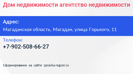 Дом недвижимости, агентство недвижимости по адресу Магаданская область, Магадан, улица Горького, 11 в дальнейшем Организация, размещена в следующих категориях: