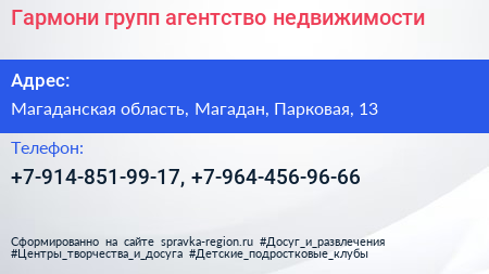 Гармони групп, агентство недвижимости по адресу Магаданская область, Магадан, Парковая, 13 в дальнейшем Организация, размещена в следующих категориях: