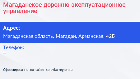 Магаданское, дорожно-эксплуатационное управление по адресу Магаданская область, Магадан, Арманская, 42Б в дальнейшем Организация, размещена в следующих категориях: