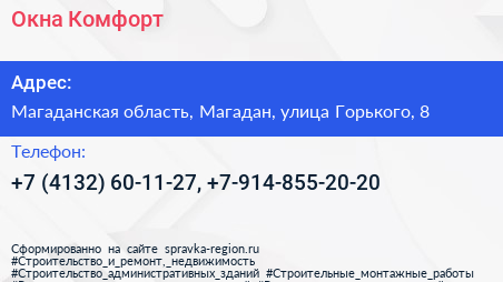 Окна Комфорт по адресу Магаданская область, Магадан, улица Горького, 8 в дальнейшем Организация, размещена в следующих категориях: