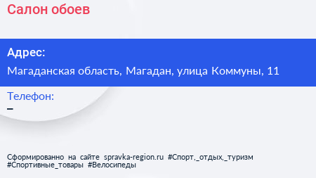 Салон обоев по адресу Магаданская область, Магадан, улица Коммуны, 11 в дальнейшем Организация, размещена в следующих категориях: