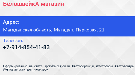 БелошвейкА, магазин по адресу Магаданская область, Магадан, Парковая, 21 в дальнейшем Организация, размещена в следующих категориях: