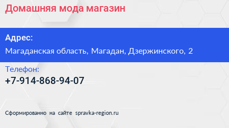 Домашняя мода, магазин по адресу Магаданская область, Магадан, Дзержинского, 2 в дальнейшем Организация, размещена в следующих категориях: