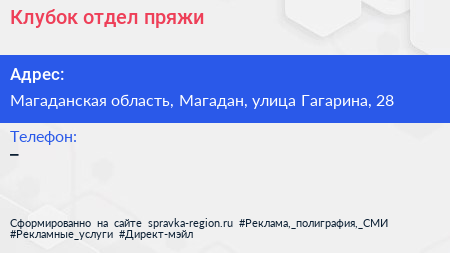 Клубок, отдел пряжи по адресу Магаданская область, Магадан, улица Гагарина, 28 в дальнейшем Организация, размещена в следующих категориях: