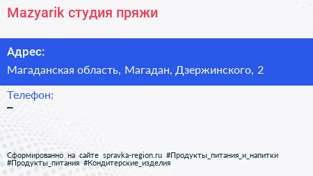 Mazyarik, студия пряжи по адресу Магаданская область, Магадан, Дзержинского, 2 в дальнейшем Организация, размещена в следующих категориях: