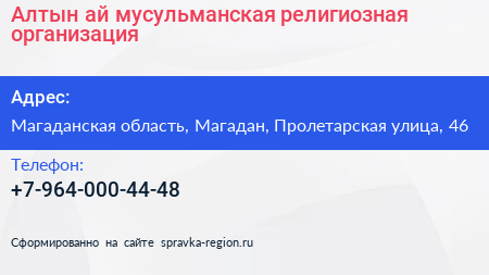 Алтын-ай, мусульманская религиозная организация по адресу Магаданская область, Магадан, Пролетарская улица, 46 в дальнейшем Организация, размещена в следующих категориях: