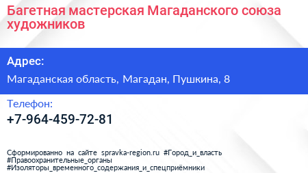 Багетная мастерская Магаданского союза художников по адресу Магаданская область, Магадан, Пушкина, 8 в дальнейшем Организация, размещена в следующих категориях: