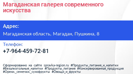 Магаданская галерея современного искусства по адресу Магаданская область, Магадан, Пушкина, 8 в дальнейшем Организация, размещена в следующих категориях: