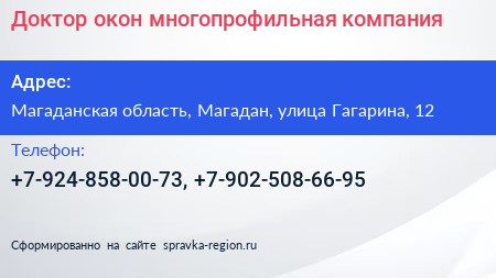 Доктор окон, многопрофильная компания по адресу Магаданская область, Магадан, улица Гагарина, 12 в дальнейшем Организация, размещена в следующих категориях:
