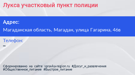 Лукса, участковый пункт полиции по адресу Магаданская область, Магадан, улица Гагарина, 46в в дальнейшем Организация, размещена в следующих категориях: